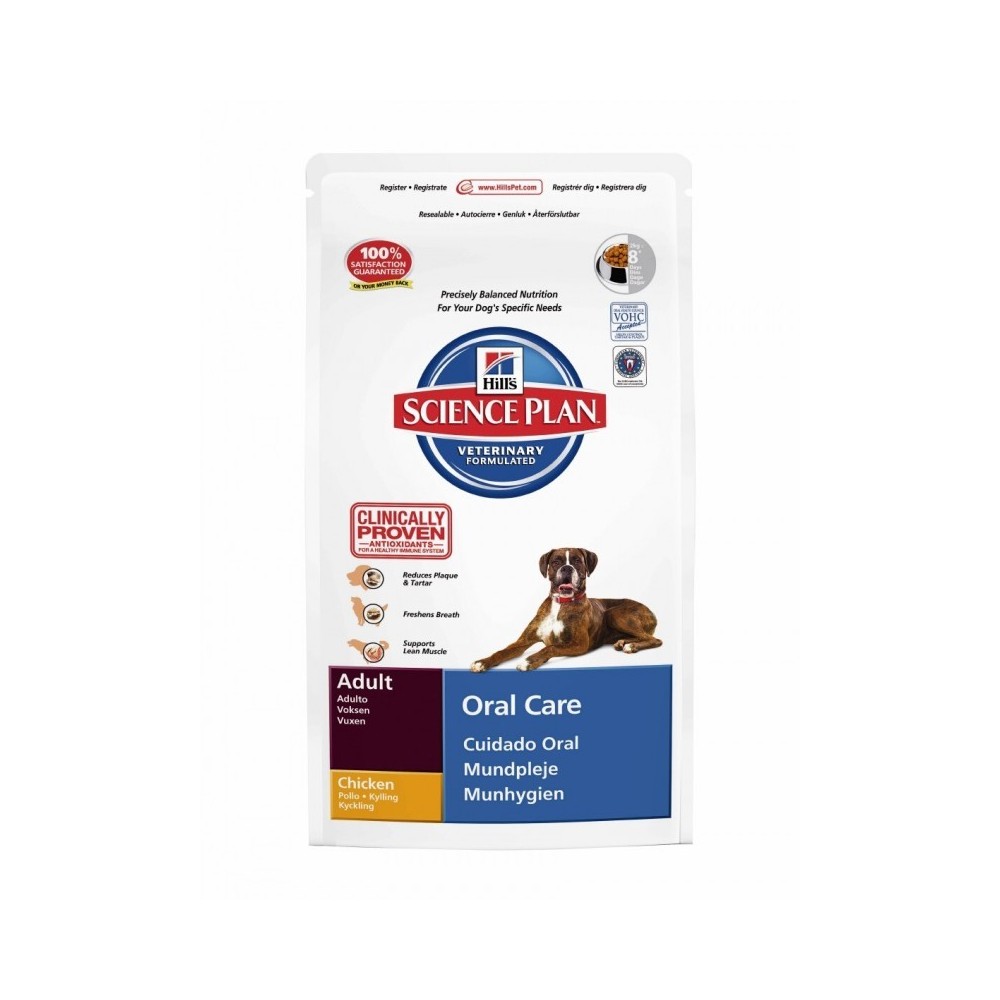 Hill's Science Plan Canine Adult Oral Care Pollo ha probado clínicamente reducir la placa dental y el sarro.