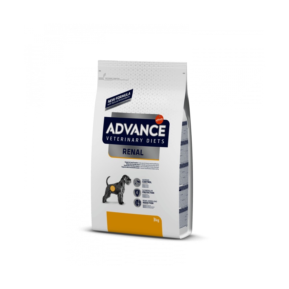 ADVANCE VETERINARY DIETS RENAL un alimento dietético completo para perros adultos, con un nivel limitado de proteínas, pero de alta calidad y con un bajo contenido en sodio, está especialmente indicado para apoyar el funcionamiento del sistema renal de tu perro en caso de insuficiencia renal crónica.