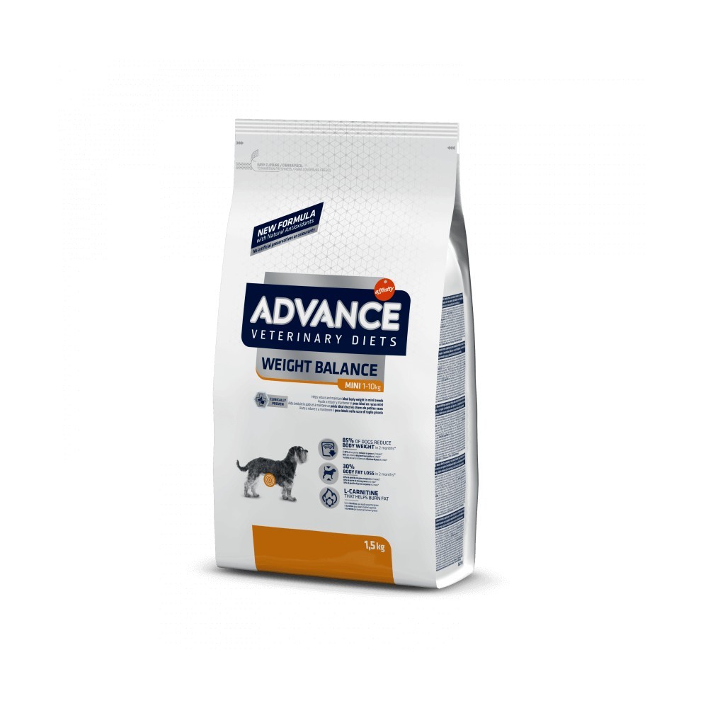 ADVANCE VETERINARY DIETS WEIGHT BALANCE MINI es un alimento dietético completo para perros mini adultos formulado para reducir el exceso de peso y regular el metabolismo lipídico en caso de hiperlipidemia, con niveles bajos de energía, bajo contenido de grasa y alto contenido de ácidos grasos esenciales. Los resultados de ADVANCE VETERINARY DIETS WEIGHT BALANCE MINI están clínicamente probado, el 85 % de los perros reduce su peso en 2 meses*. ADVANCE VETERINARY DIETS WEIGHT BALANCE MINI contiene croquetas específicamente adaptadas al tamaño y necesidades de tu perro mini (<10kg).