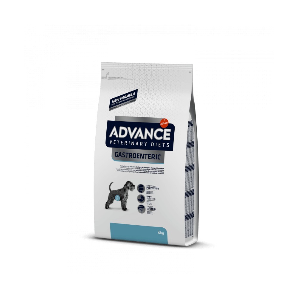 ADVANCE VETERINARY DIETS GASTROENTERIC es un alimento dietético completo para cachorros y perros adultos, elaborado con ingredientes muy digestibles, nivel bajo de grasa y una mayor proporción de sodio y potasio para reducir los trastornos gastrointestinales y para casos de insuficiencia pancreática exocrina.