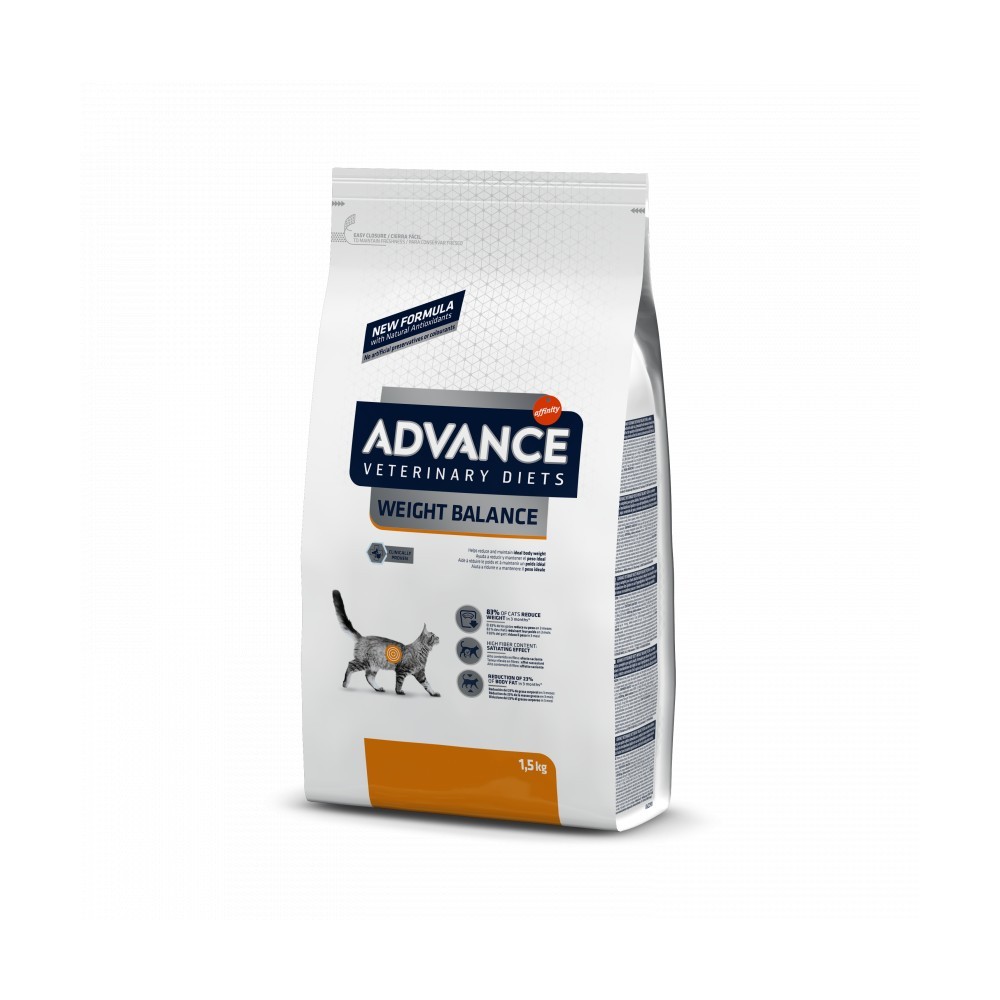 ADVANCE VETERINARY DIETS WEIGHT BALANCE FELINE es un alimento dietético completo para gatos adultos, formulado para reducir el exceso de peso y regular el metabolismo lipídico en caso de hiperlipidemia, con niveles bajos de energía, bajo contenido de grasa y elevado contenido de ácidos grasos esenciales. Los resultados de ADVANCE VETERINARY DIETS WEIGHT BALANCE FELINE están clínicamente probados, el 83% de los gatos reducen su peso en 3 meses*.