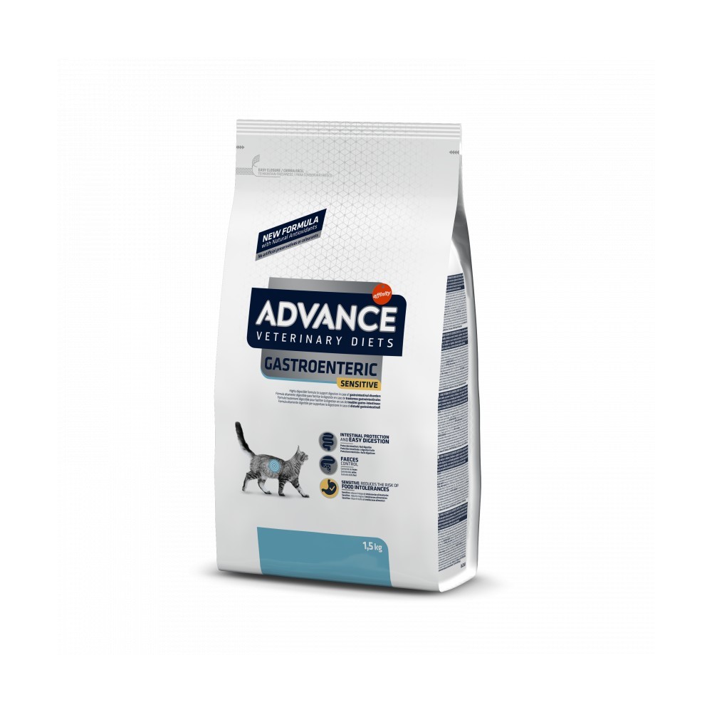 ADVANCE VETERINARY DIETS GASTROENTERIC SENSITIVE FELINE es un alimento dietético completo para gatos adultos que ayuda compensar las alteraciones de la digestión en caso de trastornos gastrointestinales y de insuficiencia pancreática exocrina. Está formulado con ingredientes altamente digestibles, moderados niveles de grasa, nivel incrementado de sodio y potasio. Está fórmulado con fuentes seleccionadas de proteínas y carbohidratos para disminuir el riesgo de reacciones adversas al alimento