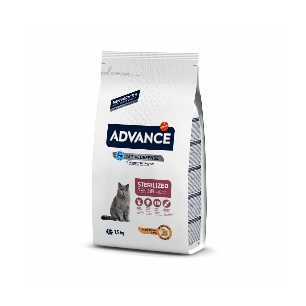 Cuando tu gato esterilizado alcanza los 10 años, entra en la etapa senior, Durante esta etapa necesita una alimentación que le ayude a minimizar los efectos de la edad, controlar su peso y cuidar su salud renal. ADVANCE Sterilized Senior es un alimento de alta gama fácil de digerir formulado para cubrir sus necesidades específicas que refuerza sus defensas y barreras naturales. Gracias a su fórmula, ayuda a metabolizar la grasa, a proteger sus riñones y a contribuye a mantener la masa muscular y preservar el cartílago de las articulaciones. ADVANCE Sterilized Senior está especialmente formulado para gatos esterilizados de más de 10 años.