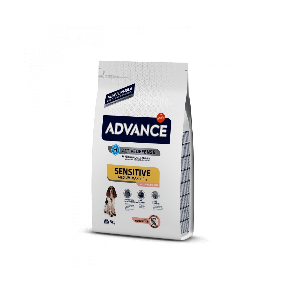 ADVANCE Sensitive Medium/Maxi es un alimento completo y equilibrado especialmente formulado para perros con sensibilidades alimentaria (+10 kg). La sensibilidad alimentaria puede manifestarse a través malas digestiones y de forma ocasional a través de síntomas cutáneos.