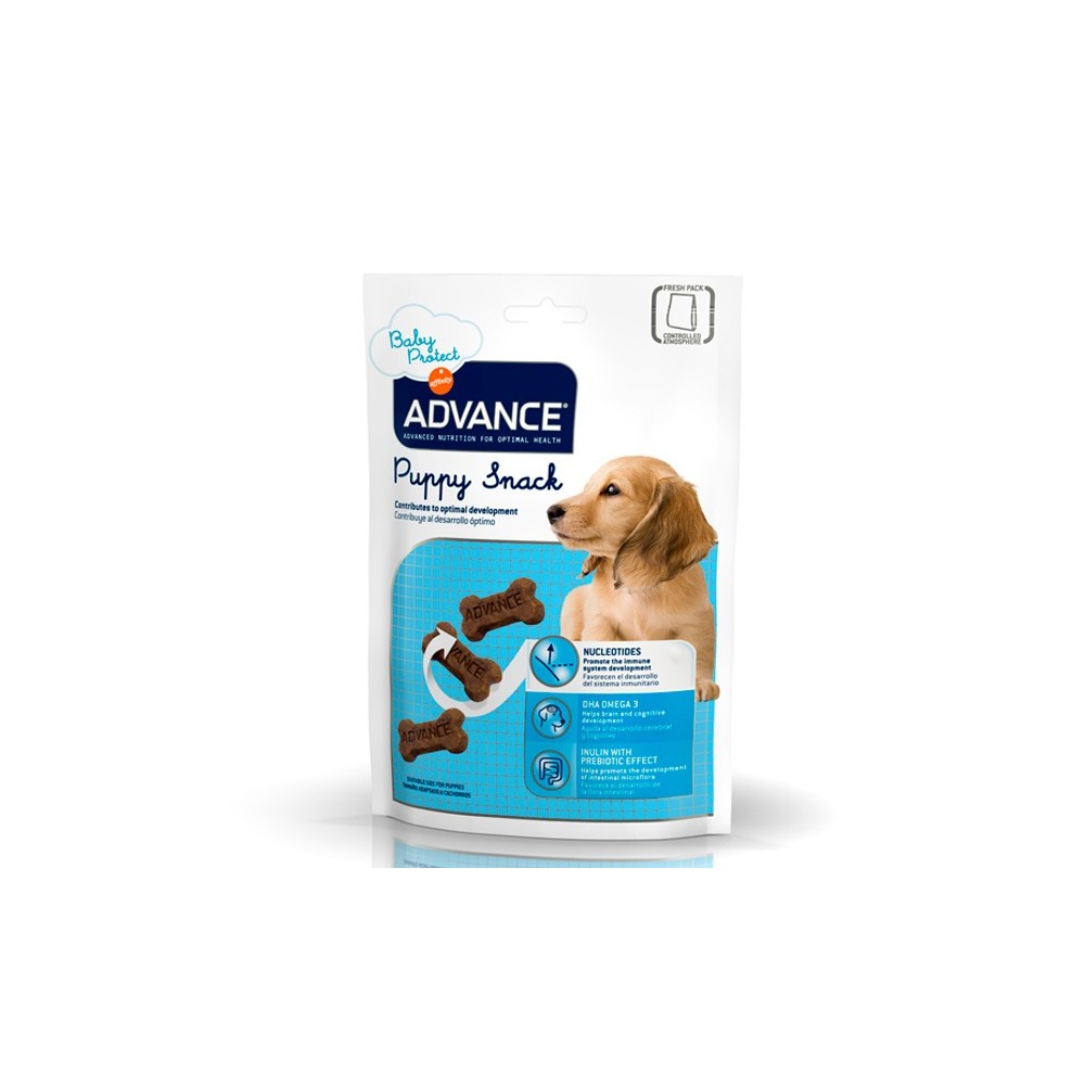 ADVANCE Puppy Snack (para cachorros de 2 a 12 meses) son unas galletas tiernas y sabrosas especialmente formuladas para contribuir al desarrollo óptimo de los cachorros gracias a la eficaz combinación de nucleótidos, DHA OMEGA 3, Inulina con efecto prebiótico.