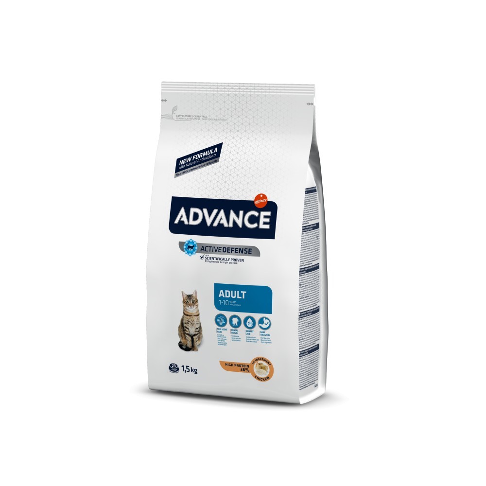 ADVANCE Adult é um alimento de alta qualidade, fácil de digerir, formulado para satisfazer as suas necessidades específicas que reforça as suas defesas e barreiras naturais e ajuda a manter um pH óptimo da urina, para controlar o tártaro e promove a saúde intestinal, pele saudável e cabelo brilhante.
